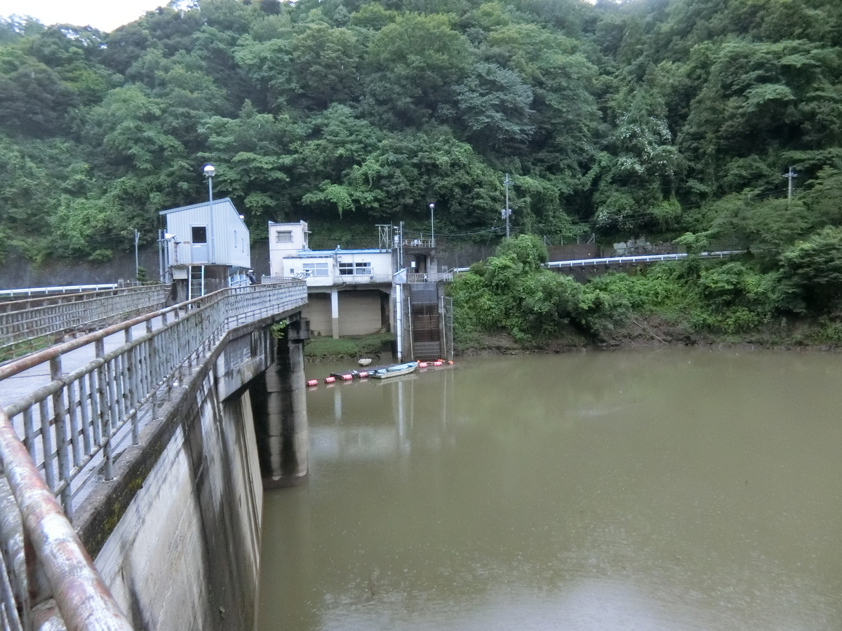 ダムの堤頂からみた管理事務所。県道34号線沿いです。